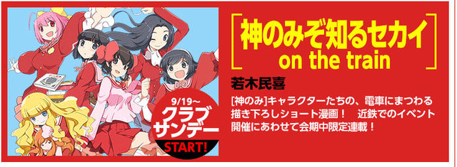 The official Weekly Shounen Sunday website has announced that the completed manga series The World God Only Knows will receive a spin-off manga series titled The World God Only Knows On The Train which will follow Keima as he tries to capture various heroines on board a train. It will be a free online manga and will start publishing on September 19th in Club Sunday.